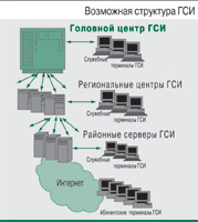 ГСИ должна иметь иерархическую структуру (рисунок).Полная база ЭИД будет храниться в каждом региональном центре (предположительно таковых будет около 200); основная и резервная копии – в головном центре. Ежедневно изменения в базе ЭИД со всех региональных центров будут пересылаться в головной, суммироваться и снова рассылаться по региональным центрам для обновления базы. Периодически должна производиться полная сверка баз ЭИД всех региональных центров. Благодаря такой организации ГСИ будет иметь почти 200-кратное резервирование информации.