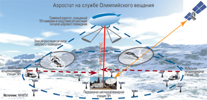 участие и зарубежных компаний. Так, предположительно беспроводные камеры с поддержкой режима HDTV производства Hitachi Kokusai Electric (Япония) будут работать на передвижных 4- и 16-камерных ТВ-станциях (ПТС) производства SES SIRIUS AB (Швеция); профессиональные студии предполагается оборудовать средствами монтажа японской компании Astrodesign (собственно монтаж ТВЧ-программ в реальном времени способна осуществить российская компания HD Media).В качестве транспорта для цифровых потоков информации в комплексном проекте предложено использовать ВОЛС, спутники, а также беспроводные каналы передачи WiMAX. Кроме того, предусмотрено использование привязного аэростата, оснащенного ТВЧ-камерами и средствами ретрансляции сигнала цифрового ТВ.