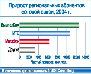 «ВымпелКом» является лидером по чистым подключениям не только в целом по России. За 10 месяцев 2004 г. оператор приобрел в 36 регионах страны больше абонентов, чем его конкуренты, у МТС и «МегаФона» таких регионов соответственно 17 и 9. Однако МТС остается лидером по объему абонентской базы в 25 регионах России («ВымпелКом»– в 20 регионах, «МегаФон»– в 15).