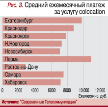 В результате с точки зрения цен на услугу colocation в целом (с учетом абонентской платы за размещение сервера и оплаты трафика по принятой модели) именно Пермь оказалась самым дорогим городом, а Ростов-на-Дону – самым дешевым (рис. 3).