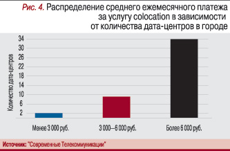 Если в качестве опорных точек выбрать 3000 руб. и 6000 руб., то получится, что в 98% региональных дата-центров средний ежемесячный платеж за colocation превышает 3000 руб., а в 73% дата-центров – более 6000 руб. (рис. 4).