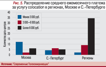 Сравним средние ежемесячные платежи за colocation, полученные в результате исследования рынка региональных дата-центров, с результатами исследования рынка дата-центров Москвы и Санкт-Петербурга (проведенного ЗАО «Современные Телекоммуникации» в мае 2007 г.). За опорные точки также взяты значения в 3000 руб. и 6000 руб. (рис. 5).