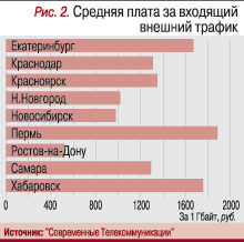 Изучение стоимости услуг коммерческих региональных дата-центров проводилось в феврале 2008 г. Различия в величине средней ежемесячной платы за размещение сервера (рис. 1*) в исследованных городах составили более 2000 руб. (500%). Это выходит за рамки разумного и может быть обусловлено различиями в тарификации трафика (рис. 2). Действительно, в РостовенаДону максимальная плата за размещение сервера (1U), но плата за 1 Гбайт трафика минимальная. Однако в Перми сравнительно до’роги и трафик, и размещение.
