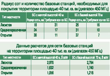 Модель, конечно, является упрощенной, но на точность экономического анализа это обстоятельство заметного влияния не окажет. Радиус сот определен на основании расчетов, в которых использованы усредненные характеристики антенно-фидерных трактов и приемопередатчиков базовых станций NMT-450, а также стандартные характеристики сотового телефона NMT. (Заметим, что по опыту уже работающих операторов размер сот в стандарте CDMA-450 в сельской местности при небольшой нагрузке на сеть практически совпадает с размером сот NMT-450.) Результаты расчетов приведены в таблицах.