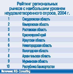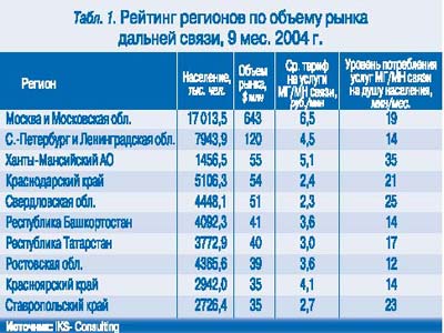 По оценке «iKS-Консалтинг», в 34 из 77 региональных телекоммуникационных рынков РФ искомый резерв существует. Проведенное компанией исследование «Телекоммуникационный потенциал российских регионов» позволяет сделать вывод, что нереализованный потенциал региональных рынков составляет как минимум 10 – 15% от полученных доходов. То есть в 2003 г. при текущем социально-экономическом развитии операторы в регионах недополучили порядка $627 млн из-за меньшего потребления услуг, чем это было обусловлено уровнем платежеспособного спроса. Причина в том, что развитие телекоммуникаций отстает от экономического роста регионов. Например, потребление услуг фиксированной связи (средний месячный доход на линию) на всех включенных в рейтинг местных рынках оказалось меньше среднероссийского показателя, который в 2003 г. составлял 335 руб. в месяц, а в 2004 г. – 342 руб.