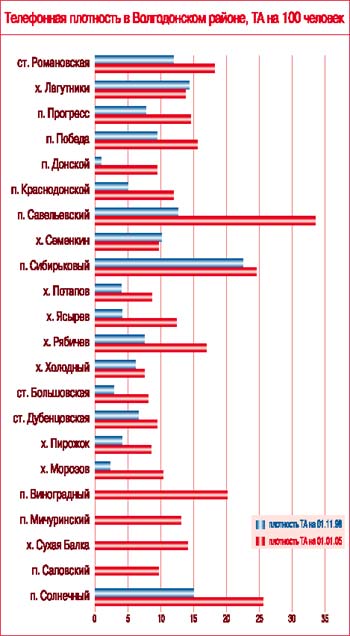 В 1997 г. телефонная плотность в Волгодонском районе – 7,38 ТА на 100 жителей, в начале 2005 г. – 13,57.