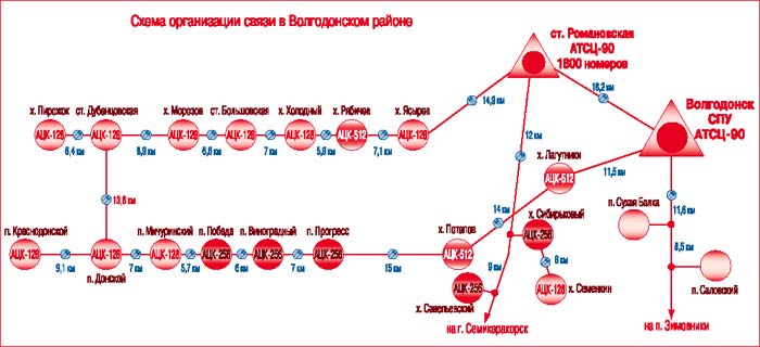 РЕКОНСТРУКЦИЯ И ТЕЛЕФОНИЗАЦИЯ. По мере завершения разработки в ЛОНИИС оборудования оптических интерфейсов АТСЦ-90 и принципов построения на его основе кольцевых оптических сетей доступа номерная емкость АТСЦ-90 увеличивалась и к 2004 г. составила 3080 номеров. В 13 населенных пунктах установили вынесенные абонентские цифровые концентраторы (АЦК). Они были включены в станцию посредством двух независимых сегментов оптической кольцевой дублированной самовосстанавливающейся сети доступа на базе недорогого встраиваемого оборудования оптических интерфейсов, входящего в состав АТСЦ-90. А сама станция превратилась в распределенный телекоммуникационный комплекс, обеспечивающий связью практически весь Волгодонский район.