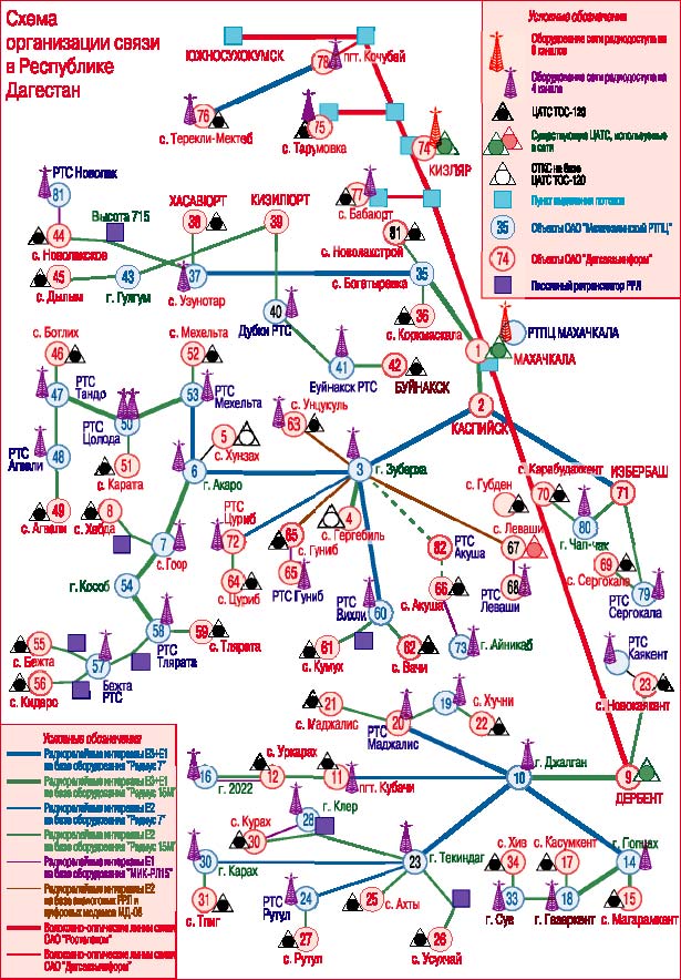 География Дагестана уникальна. Вряд ли в России еще найдется такое скопление гор. Телефонизировать горные села крайне трудно. К 2001 г. из 1532 сельских населенных пунктов республики связь имели лишь 796; телефонная плотность СТС в Дагестане была одной из самых низких в России (3,2 ТА на 100 жителей, в то время как в среднем по РФ – 9,4). Такое положение дел не могло устраивать ни республиканскую власть, ни связистов. В 2001 г. Правительство РД разработало социальную Программу развития сельской связи в Республике Дагестан на 2001 – 2002 гг., которая предусматривала строительство и ввод в эксплуатацию в каждом районе республики сельских ЦАТС, установку ТА в каждом поселении. Программа стала одним из базовых документов для ОАО «Телеком», предложившего свою концепцию развития СТС в регионе. Она и была реализована в 2002 – 2004 гг. В результате сдана «под ключ» и уже два года находится в опытной эксплуатации внутризоновая цифровая сеть сельской связи, построенная исключительно на отечественном оборудовании. В ее составе информационно-транспортная радиорелейная сеть (76 интервалов) протяженностью 1250 км; сеть из 38 цифровых АТС общей емкостью более 8 тыс. номеров с возможностью расширения до 150 тыс. номеров; сеть абонентского радиодоступа на основе транкингового стандарта МРТ-1327 емкостью около 3 тыс. абонентов. Сеть покрывает более 95% Дагестана.