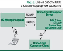 Возможны два варианта использования UCC – персональный (рис. 2) и клиент-серверный (рис. 3). В первом случае клиентское приложение UCC представляет собой TAPI-драйвер, с которым через UC500 взаимодействует телефонный аппарат. Приложение «отслеживает» всю сигнальную информацию, что обеспечивает «управление вызовами».