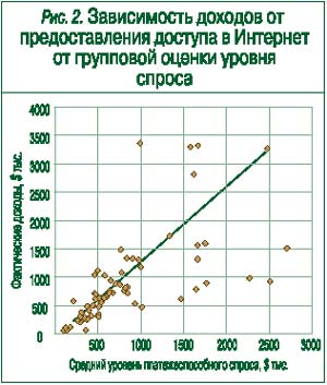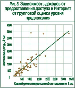 Прибыль, получаемая операторами от услуг доступа в Интернет, почти не зависит от доходов и средней заработной платы пользователей. То же можно сказать и о показателях, косвенно отражающих скрытые от официальной статистики доходы (число автомобилей, жилплощадь на одного человека): их влияние оценивается в 5 – 15% . Не имеют значения и инфраструктурные показатели (плотность автомобильных дорог, площадь региона и т. д.), которые важны для анализа доходов от основной деятельности операторов.