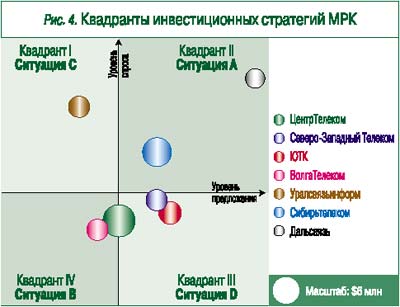 Показатели деятельности межрегиональных операторов связи объединены в четыре агрегированные оценки спроса и предложения (табл. 4), тогда как их дифференциация по филиалам внутри каждой МРК значительна. Единый подход к оценке дополнительных возможностей и ограничений по росту доходов от Интернета позволяет построить квадрант инвестиционных стратегий этих компаний (рис. 4).