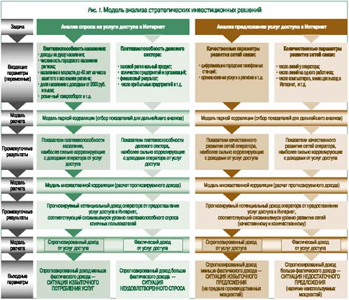 Модель расчета Выделять стратегические направления инвестирования средств оператора связи можно путем сопоставления уровней спроса и предложения услуг доступа в Интернет (рис. 1). Модель расчета содержит входящие параметры, собственно расчет и выходные данные (результирующие показатели), к которым относятся максимально возможный объем доходов оператора от предоставления доступа в Интернет при сложившейся платежеспособности конечных пользователей услуг (для оценки спроса) или при достигнутом уровне развития техники/технологий связи передачи данных (для оценки предложения).