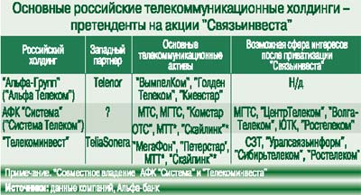 Ядром консорциума «Альфа-Групп» /Telenor могут выступить «ВымпелКом» и «Голден Телеком» (Россия и страны СНГ), а также «Киевстар». До сих пор нет ясности, будет ли данный консорциум участвовать в приватизации «Связьинвеста» и на какие активы он может претендовать впоследствии.