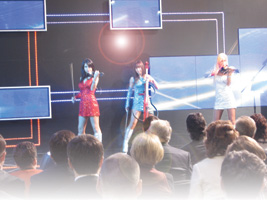 «Время, вперед!» – свиридовская тема, звучащая с главного экрана страны аж с 1968 г., в исполнении юных скрипачек и виолончелистки на открытии выставки знаменовала собой традиции и новаторство. Ассоциативные опасения услышать в попурри отголоски «Лебединого озера», к счастью, не подтвердились.Приглашение Петра Кулешова из «Своей игры» вести шоу открытия «Инфокома» – намек на интеллектуальную направленность всего действа, поддержанную мелькавшими на экране портретами Циолковского, Курчатова, Сахарова, Жореса Алферова – людей, соединивших в себе гениальность предвидения и демократические ценности. Министр Щеголев добавил в этот список Жюля Верна и Артура Кларка.
