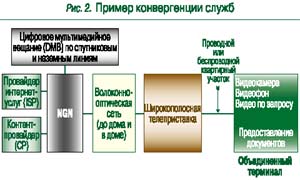 Рекомендация Y. 2011 имеет два приложения и два дополнения. В приложениях А и В рассмотрена применимость к NGN отдельных разделов Рекомендации Х. 200 (о базовой эталонной модели ВОС). Дополнение I содержит возможные принципы взаимодействия NGN с не-NGN-сетями. В дополнении II приведен пример конвергенции служб для объединенного терминала (рис. 2). Скорость для одного абонента в этом примере равна 100 Мбит/с (3 канала по 4 Мбит/с для телевидения высокой четкости; 4 канала по 4 Мбит/с для видеофона; 20 Мбит/с для Интернета; 2 Мбит/с для высококачественной голосовой службы). Сравнение первых двух рекомендаций по NGN с рекомендациями по ГИИ показывает их близость (табл. 2). Поэтому взгляд МСЭ-Т на NGN как на конкретную реализацию общей идеи ГИИ вполне оправдан.