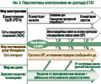 Что же может дать идея NGN для развития электросвязи? В одном из докладов ETSI [2 ]была приведена схема «Перспективы электросвязи» (рис. 3). В ней NGN представлена в виде будущей самостоятельной глобальной сети, конкурирующей с телефонной сетью (ТфОП), сетью Интернет и вещательными сетями. Эту модель можно считать первым предельным вариантом развития идеи NGN, при котором NGN будет «отнимать» телефонный трафик от ТфОП, как это уже делает Интернет. Второй предельный вариант – отсутствие глобальной сети NGN и использование технологий NGN для модернизации сети ТфОП и, возможно, сетей Интернет и вещания. (Заметим, что в Рекомендациях Y. 2001 и Y. 2011 говорится не о единственной NGN, а о многих NGN. ) Жизнь, конечно, может преподнести и промежуточные варианты.