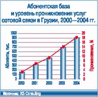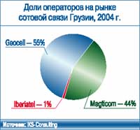 По итогам 2004 г. объем рынка телекоммуникаций Грузии превысил $310 млн. Более 60% всех доходов (почти $195 млн.) отрасли принесли мобильные операторы. Общее количество сотовых абонентов в республике – чуть более 900 тыс., уровень проникновения – 18,5%. Несмотря на то что по последнему показателю Грузия занимает пятое место среди стран СНГ (без учета России), темпы роста абонентской базы сложно назвать очень высокими – за прошлый год абонентская база выросла лишь на 30%. Кто на рынке хозяин?