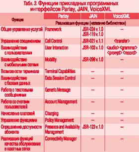 Как видно из табл. 3, в Parlay стандартизировано наибольшее число функций, что обусловлено ее изначальным назначением. Таким образом, эта технология наиболее адаптирована для разработки услуг как для проводной телефонной, так и мобильной сети связи. JAIN рассматривается скорее как средство разработки услуг Parlay, а не самостоятельная технология. В VoiceXML стандартизированы только функции управления соединением и взаимодействия с пользователем. Однако этого достаточно для быстрой и удобной разработки голосовых интерфейсов для web-сайтов и интернет-порталов.