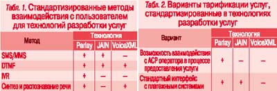 Отсутствие стандартизированных функций реализации какого-либо метода взаимодействия с пользователем у той или иной технологии разработки услуг не означает невозможность его использования (табл. 1). Так, для JAIN не стандартизированы функции взаимодействия с IVR, синтеза и распознавания речи. Все они поддерживаются фирменным интерфейсом производителя оборудования. Для VoiceXML не стандартизированы функции обработки SMS/MMS и взаимодействия с IVR – их реализует механизм внедренных объектов языка XML.