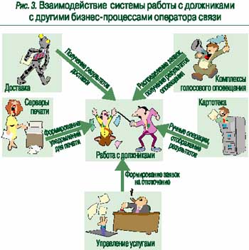 Процесс перехода клиента со стадии на стадию полностью автоматизирован. Система берет на себя формирование актуального списка должников, проверку условий перевода, собственно перевод на новую стадию работ, прекращение работы по плану при поступлении оплаты и формирование списков для ручной работы. Для нормального функционирования система работы с должниками должна осуществлять обмен информацией с рядом других систем (рис. 3).