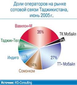 Рынок сотовой связи Таджикистана тоже трудно назвать развитым: по уровню проникновения мобильных услуг страна занимает предпоследнее место среди государств Содружества – 3,1% на конец первого полугодия 2005 г. Общее количество абонентов на тот же период составляло порядка 200 тыс. (в конце 2004 г. – 159 тыс.). Между тем по числу сотовых операторов беднейшее государство Центральной Азии опережает соседей по региону. На небольшой, в общем-то, территории (143,1 тыс. кв. км), 93% которой покрыто горными массивами, действуют шесть компаний. Пять из них – «Тоджфон» («Таджик-Тел»), СП «Сомонком», ЗАО «ТТ-Мобайл» (более известное как МЛТ), СОАО «Вавилон-Мобайл», ЗАО «Индиго Таджикистан» – предоставляют услуги в стандарте GSM и одна – ЗАО «ТК Мобайл» – работает в стандарте CDMA2000 1х на частоте 450 МГц. В 2004 г. Министерство связи Республики Таджикистан выдало еще три лицензии в стандарте CDMA – их обладателями стали ОАО «Точиктелеком», ЗАО «М-Теко» и СООО «ТелекомИНК». Лидирует «Вавилон-Мобайл» с 36%-ной долей рынка.