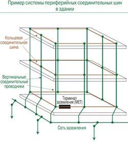 Использование соединительных перемычек позволяет в большой степени сгладить разницу уровней напряжения металлических структур. Для выполнения этой функции в условиях переходных процессов важно, чтобы индуктивность проводников (следовательно, и их длина) была минимальной, а проводники, находящиеся на периферии телекоммуникационного предприятия, образовывали сеть наподобие увеличенной клетки Фарадея. Периферийная система шин состоит из кольцевых проводников, которые устанавливаются на каждом этаже сооружения по всему внутреннему периметру здания, и вертикальных проводников-перемычек, соединяющих этажные кольцевые структуры с кольцевым заземлением, расположенным на первом этаже. При этом расстояние между вертикальными перемычками должно быть не более 5 м. Любые металлические рамы, шкафы, ограждения, трубопроводы, металлический каркас здания, этажные шины заземления, металлизированные полы и потолки и т.д. должны подключаться к общей соединительной системе в нескольких точках. Периферийная соединительная шина на первом этаже действует как «протяженный» главный терминал заземления.