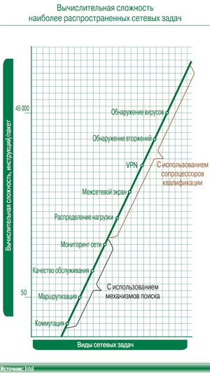 Впрочем, реализация такой широкой функциональности требует весьма значительных вычислительных ресурсов и не лучшим образом сказывается на общей производительности системы. Ситуацию усугубляет то, что «дополнительный функционал» требует гораздо больших вычислительных затрат, чем реализация базовых задач. Так, если для решения задачи маршрутизации на 3-м уровне достаточно 50 инструкций на пакет длиной 1500 байт, то антивирусное сканирование (7-й уровень) для обработки того же пакета требует уже 45 тыс. инструкций – в 900 раз больше (рисунок). Именно поэтому программная реализация IDPфункций так негативно сказывается на общей производительности системы и не применима в вычислительных средах, работающих в режиме реального времени. В таких случаях не обойтись без аппаратного ускорения этих функций, что позволит обеспечить требуемый уровень безопасности и приемлемую для нормальной работы производительность сети.