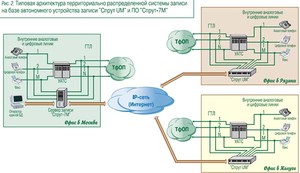 Как уже говорилось, практически любая система записи – это компьютер и установленная в нем плата, обеспечивающая соединение с телефонными линиями. Поэтому теоретически выход из рассмотренной ситуации достаточно прост: если компьютер должен подключаться через плату к территориально удаленной линии, то лучше не пытаться соединить эту линию длинными проводами с компьютером, а расположить плату в непосредственной близости от линии и передавать информацию на компьютер через такое доступное сейчас средство, как Интернет, или через локальную сеть предприятия. При подобной схеме построения требуется только один компьютер, благодаря чему сохраняются все преимущества централизованной системы. Этот компьютер осуществляет накопление и систематизацию информации.