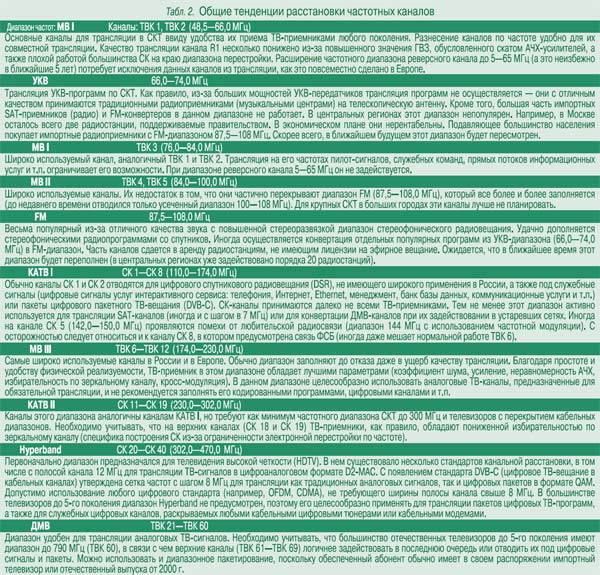 Не вдаваясь в подробности, приведем общие тенденции расстановки каналов по диапазонам, которые в определенной мере согласуются с Генеральным частотным планом для широкополосных сетей кабельного телевидения г. Москвы (утвержден 19.09.96). Приводимые рекомендации (табл. 2) не следует воспринимать как обязательные. Тем не менее в них учтены региональные особенности России, характер внедряемых услуг интерактивного сервиса, типы (возможности) ТВ-приемников, требование трансляции в отведенных диапазонах обязательных (доступных) российских ТВ-программ и т.п.