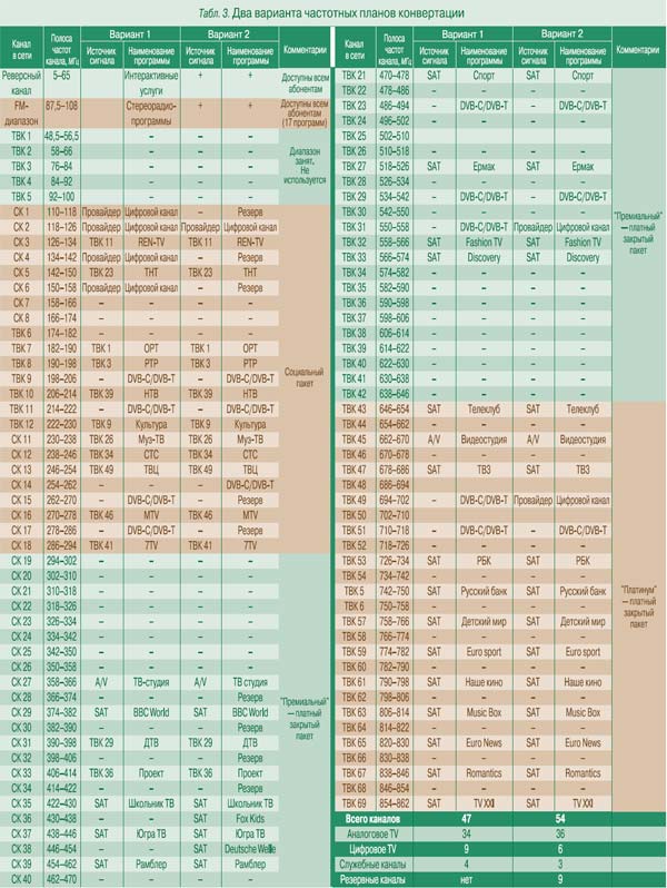 В табл. 3 приведены два варианта частотных планов конвертации на 50 и 57 каналов. По согласованию с заказчиком наименования некоторых каналов изменены. Вариант 1 является наиболее помехозащищенным, вариант 2 – менее помехозащищенным, но с бо’льшим числом каналов. (Надо заметить, что ФГУП ГРЧЦ, ознакомившись с техническим обоснованием, согласился утвердить любой из этих вариантов с незначительными правками и комментариями.) В эфире используются каналы ТВК 1, ТВК 3, ТВК 9, ТВК 23, ТВК 26, ТВК 29, ТВК 34, ТВК 36, ТВК 39, ТВК 41, ТВК 49. Предусмотрен канал видеостудии. Частотный план конвертации FM-каналов радиовещания составлялся отдельно.