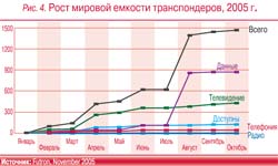 Обратимся к результатам исследований этого рынка компанией Futron, проведенных по заказуSatellite Industry Association, и начнем с 2004 г. (рис. 1, 2), когда создавался фундамент основных тенденций 2005 г. Хотя цены на ресурсы в 2004 г. продолжали снижаться, в целом наблюдался рост отрасли, который обусловили главным образом четыре фактора: растущий спрос на емкости в правительственно-военном секторе, появление коммерческого HDTV-оборудования; расширение рынка широкополосных сервисов(особенно широкополосный интерактивный доступ для рынка SOHO – DVB/RCS, а также аналогичные технологии для VSAT этого класса, в том числе на базе IP); наконец, широкополосная мобильная связь(включая связь на борту самолета). Немалый вклад внесла и растущая популярность СС в мире сетевой торговли (по примеру Wal-Mart). Рост продолжился и в 2005 г. (рис. 3), а проекты «сетей-движителей роста» (WildBlue, Connection by Boieng, IP-PRIME и др.)стали «хитами» года.