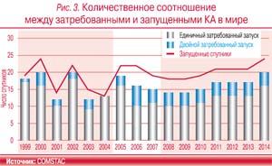 А вот по объему запусков КА Россия за прошедший год вышла на первое место в мире, тем более что запускались не только «Экспрессы» для обновления нашей ОГ, но и спутники других операторов (из последних – SES Global). Наиболее прочные позиции на российском операторском рынке у ГПКС и «Газкома». Им принадлежит ОГ из18 КА (ГПКС – 15, «Газком» – 3). В активе ГПКС также емкости Ku-диапазона, арендуемые на EutelsatW4. Вместе с тем 7 из 15 спутников ГПКС выработали свой ресурс и находятся за пределами гарантированного САС, так что основная нагрузка ложится на5 новых КА «Экспресс-АМ», запущенных в последние два года.