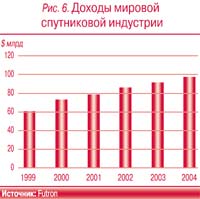 Рынок фиксированной СС к началу 2005 г. оценивался аналитиками Futron как стабильный, с суммарным доходом свыше $100 млрд (рис. 6). Растет объем инвестиций в отрасль: по данным Euroconsult, суммарные вложения в PanAmSat, New Skies Satellites,Eutelsat и Intelsat только в 2004 г. превысили $10млрд. Основные игроки продолжали укрупняться(последняя сделка – покупка PanAmSat компанией Intelsat, присоединившей при этом к своим 28 КАеще 25) и обновляться: в 2005 г. было запущено около 30 новых ГЕО КА (данные COMSTAС). Весома и доля ГПКС в этом процессе: 5 КА «Экспресс-АМ».Мировая тенденция – утяжеление КА (2003 г. – 3,3 т;2004 г. – 4,2 т; 2005 г. – 4,6 т) и снижение стоимости годовой аренды полосы 36 МГц (к 2006 г. – до $1,2млн для диапазона С, до $2 млн – для Ku).