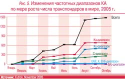 Ушедший год для СС можно смело назвать годом IP: по данным Futron, объем ресурсов для передачиданных (включая IP-телефонию) вырос за полгода практически в 30 раз (рис. 4), причем очевидно преобладание использования Ku- и Ka-ресурсов (рис. 5).Количество Ka-транспондеров в разных ОГ считают уже десятками (в эквиваленте 36 МГц), а их общее число давно превысило сотню.