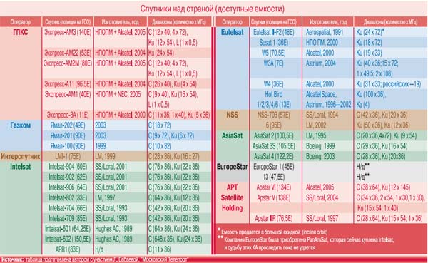 На российском рынке СС игроков немало (см.таблицу). Оценить их доли чрезвычайно сложно по двум причинам. Во-первых, многие емкости продаются на правах субаренды на так называемом вторичном рынке. Так, ресурсы спутника W4, принадлежащего Eutelsat, в России продают Eutelsat, ГПКС и «Интерспутник», причем каждый «засчитывает» их в свою долю. В результате сумма долей игроков намного больше 100% (см. «Парад планет»). Во-вторых, реальную долю может показать лишь объем действительно загруженных емкостей каждого оператора, а это «страшная» коммерческая тайна всех операторов, поскольку чаще всего эта цифра оказывается меньше «величины проданной». Тем не менее, руководствуясь открытыми данными о количестве «удобных» для страны спутников, обслуживаемых сетей и каналов, рискну ранжировать российскую шестерку: ГПКС, Intelsat, Eutelsat, «Газком», «Интерспутник», NSS.