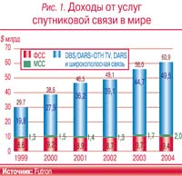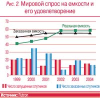 «Емкое» небо планетыНе вдаваясь в рассуждения о роли и месте спутниковой связи в стране и мире, перейдем сразу к цифрам. На конец 2005 г. количество геостационарных КА связи и вещания (ГЕО КА) в обще мировой ОГ перевалило за 300, число действующих спутниковых операторов приблизилось к полусотне, а общий доход отрасли, по данным SatMagazine, достиг $100 млрд.