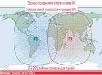 Конечно, точного сравнения BGAN с существующими системами связи быть не может, поскольку в ней организация связи отличается от традиционной (см. рисунок). Спутник имеет глобальный луч, 19 региональных и 228 узких. Первые два типа лучей обслуживают также традиционные сервисы Inmarsat. Узкие лучи образуют зональное покрытие BGAN, обеспечивающее многократное использование частотного ресурса и высокую энергетику. Диаметр зоны покрытия одного узкого луча – около 800 км – позволяет одновременно работать нескольким сотням абонентов (точные данные даст бета-тестирование); пропускная способность – свыше 1,5 Мбит/c.