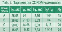 Технической основой формата DRM является принцип формирования цифровой последовательности из кадров и супер кадров COFDM-символов (табл. 1). Каждый из COFDM-символов (число COFDM-символов в одном кадре – Ns) передается за время Ts, равное сумме двух составляющих: продолжительности полезной (информационной) части Ти и защитного промежутка Тз. Общая длительность кадра во всех режимах 400 мс. С усложнением условий работы в радиоканале увеличивается длительность интервала Тз, который в режиме работы D становится соизмеримым с Ти COFDM-символа (табл. 2). Временны’е соотношения COFDM-символа могут быть представлены кратными числами условного элементарного отрезка времени Т = 3 83 мкс. В формате DRM предусмотрена возможность совместной передачи нескольких звуковых программ (до четырех) и данных – они формируют основной мультисервисный канал (Main Service Channel, MSC) . Для повышения качества и надежности работы системы дополнительно к MSC формируются два вспомогательных канала: