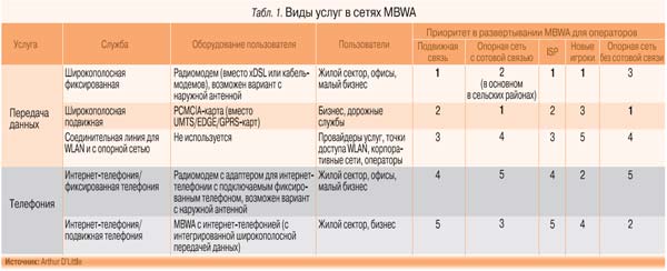 Сети MBWA обеспечивают прозрачный доступ для доставки широкого спектра фиксированных и мобильных широкополосных услуг по общей инфраструктуре (табл. 1), включая как фиксированную, так и «кочующую» передачу данных, фиксированную и мобильную услугу VoIP. В этих сетях используются абонентские терминалы с VoIP-функциями и встроенной широкополосной передачей данных. В системах с высокой пропускной способностью средства MBWA могут выступать в роли радиорелейной линии связи для WLAN.