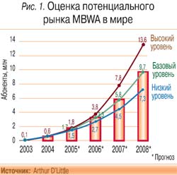 Исходя из нынешней ситуации, к 2008 г. можно прогнозировать до 9,7 млн абонентов MBWA, 2/3 из них составят корпоративные пользователи и 1/3 – физические лица. При этом нужно учитывать, что сегодняшние абоненты фиксированных систем широкополосного доступа завтра могут оказаться в числе пользователей MBWA, а это означает, что приведенная оценка числа пользователей может увеличиться еще на 30% (рис. 1).