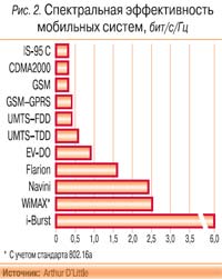 Потребности в спектре, эффективность использования которого является ключевым параметром для развертывания систем MBWA, колеблются от 1,25 МГц для систем с частотным дуплексом FDD фирмы Flarion до 21 МГц для некоторых разновидностей стандарта WiMAX (рис. 2). И хотя потребности в спектре для таких технологий, как WiMAX, Navini и i-Burst, невысоки, важно выяснить, найдется ли для них подходящий спектр в конкретной стране. Например, если национальное законодательство в области выделения частотного спектра для CDMA или GSM определяется международными стандартами, то частоты для WiMAX и многих фирменных систем закрытых стандартов зависят от распределения радиочастотного спектра (РЧС) в каждой конкретной стране.
