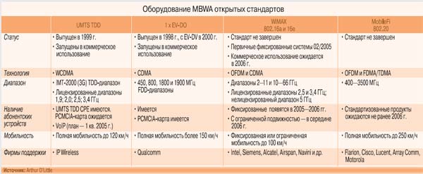 Несколько промышленных групп разрабатывают решения для MBWA на основе открытых стандартов (таблица). Например, фирма IP Wireless с 2002 г. запустила в коммерческую эксплуатацию 10 сетей разного размера с использованием технологии беспроводного доступа системы связи 3-го поколения с дуплексом на основе временного разделения (IP Wireless's UMTS TDD-based technology). Операторы сетей CDMA2000 идут по эволюционному пути, внедряя технологию 1xEV-DO/DV и применяя IPR и микросхемы, поставляемые американской фирмой Qualcomm.