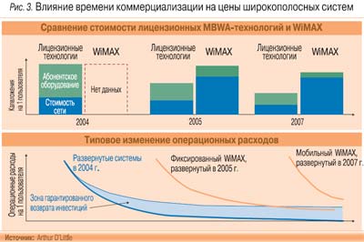 Важный момент – время для достижения технологией WiMAX того же уровня рыночной зрелости, что и у существующих MBWA-систем, хотя для лицензионных технологий может быть спрогнозирован более высокий показатель стоимости в расчете на одного пользователя из-за небольших объемов производства. Более раннее вхождение MBWA в рынок позволит получить, а возможно, и сохранить ценовые преимущества перед технологией WiMAX за счет более поздней коммерциализации последней.