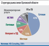 Но и у связистов есть свои лидеры. Первое место по доходам, конечно же, у сотовой связи, которая принесла основным игрокам этого рынка около $60 млн. А игроков здесь трое, и все они хорошо известны – это местные филиалы МТС, «ВымпелКома» и «МегаФона». Последний вышел на рынок Орловской области позже своих коллег по «большой тройке». Тем не менее к концу 2008 г. абонентская база оператора превысила отметку в 210 тыс. активных абонентов. Всего же, по оценкам iKS-Consulting, на конец 2008 г. в регионе насчитывалось немногим более 850 тыс. абонентов сотовой связи при общем числе жителей 860 тыс. человек, а уровень проникновения услуг сотовой связи составил порядка 102%. Однако расслабляться «большой тройке» нельзя: возможно, уже в нынешнем году в регион придет один из самых агрессивных игроков на российском рынке сотовой связи – компания Tele2, получившая лицензию на развитие своей GSM-сети в Орловской области.