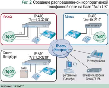 Создание распределенной корпоративной телефонной сети. С помощью «Агат UX» можно объединить несколько офисов в общую телефонную сеть с единым номерным планом (рис. 2). В каждом офисе устройство может подключаться к действующей УАТС или использоваться как самостоятельная станция.