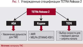 В 2005 г. технический комитет TETRA занимался завершением трех работ в рамках спецификаций TETRA Release 2 (T2), заявленных еще в 2001 г. (рис. 1).Первая (Air-Groud-Air, AGA) – развитие и оптимизация спецификаций радиоинтерфейса TETRA с целью расширения зоны действия TETRA-системы в режиме TMO (Trunked Mode Operation – режим транкинга) и снижения стоимости развертывания систем подвижной профессиональной связи для служб безопасности морского и воздушного транспорта, а также для организации сельской телефонной связи и «линейной» – вдоль нефте- и газопроводов.