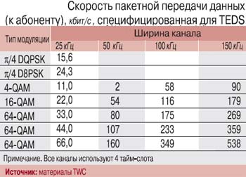 Служба TEDS – «свеже утвержденная», она базируется на использовании в системе нескольких несущих при разной ширине канала в рамках технологии TDMA и оптимизирована для данного стека протоколов. При этом на каждой из несущих реализована собственная схема адаптивной модуляции, обеспечивающая разную скорость передачи информации – от 10 до 500 кбит/c (см. таблицу). Существенно и то, что разные скоростные режимы могут поддерживаться в различных секторах зоны обслуживания, а дальность связи заметно увеличивается при выборе более широкого канала. Обеспечена полная совместимость с T1 (для реализации TEDS не нужны дополнительные сайты), и определены сценарии миграции от существующей системы к сети с более высокой скоростью.
