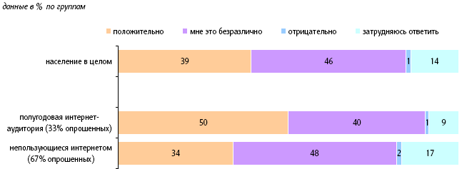 Россияне не только довольно осведомлены о появлении президента в блогосфере, но в целом неплохо это восприняли. Около 40% населения положительно относятся к этому факту, и только 1% – отрицательно. Остальные либо говорят, что им это безразлично (46%), либо затрудняются дать ответ (14%). Среди представителей полугодовой интернет-аудитории половина одобряют вступление президента в ряды блогеров.