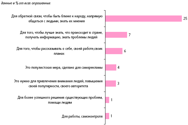 Каждый четвертый (25%) считает, что это сделано для обратной связи, чтобы быть ближе к народу, напрямую общаться с людьми, знать их мнения: «к нему можно обратиться и задать свои вопросы»; «для более тесного общения с народом»; «приблизиться к народу»; «знать мнение народа»; «чтобы напрямую связываться со своим электоратом».