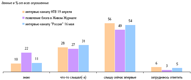 Сопоставление результатов опросов показывает, что осведомленность населения о появлении блога президента Д. Медведева в Живом Журнале выше, чем информированность о его регулярных интервью центральным телеканалам.